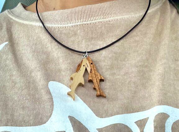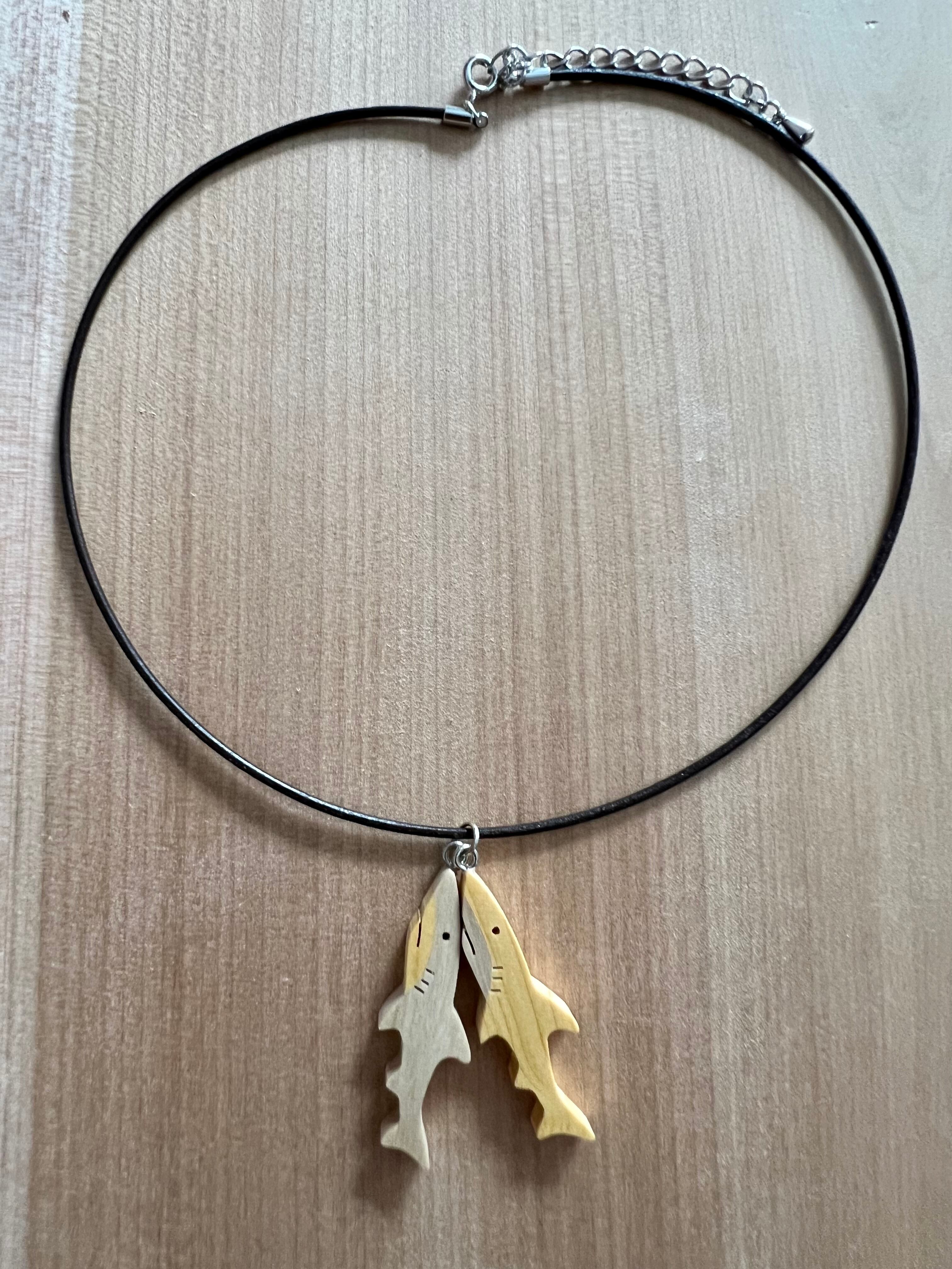 黄色のカヤ(1.2枚目)、茶色のエンジュ(3.4枚目)・アカガシ(5枚目)、白い部分にはイタヤカエデを使用した、小さなサメの木製ネックレスです。ツートンカラーの2匹がよりそう様子がかわいく目を引き、木製で軽いので首に負担もかかりません。