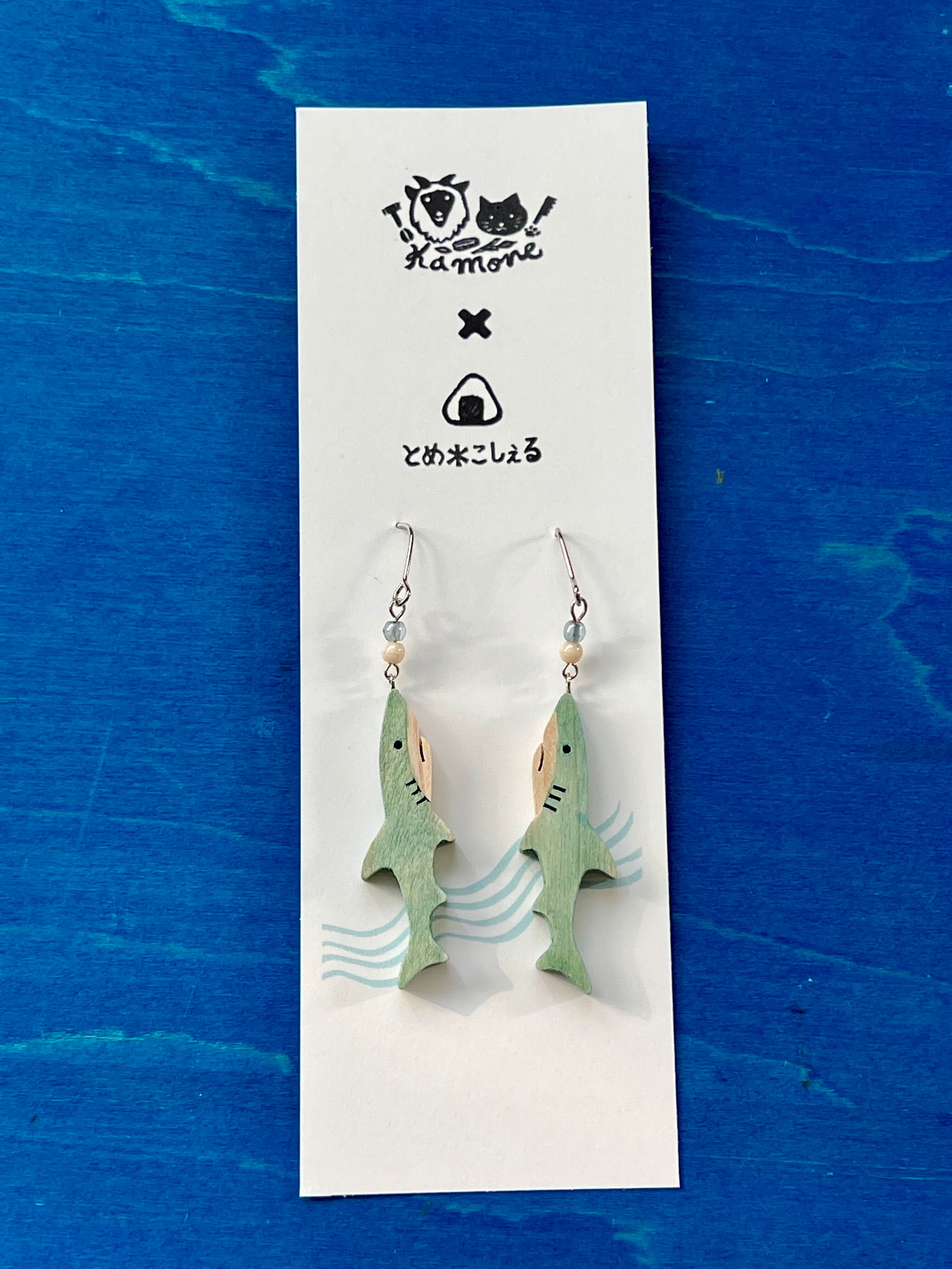 kamoneの木のサメに、とめ*こしぇるさんが藍染めを施して完成した、自然素材の温かみが感じられる、美しい藍染めサメピアスです。