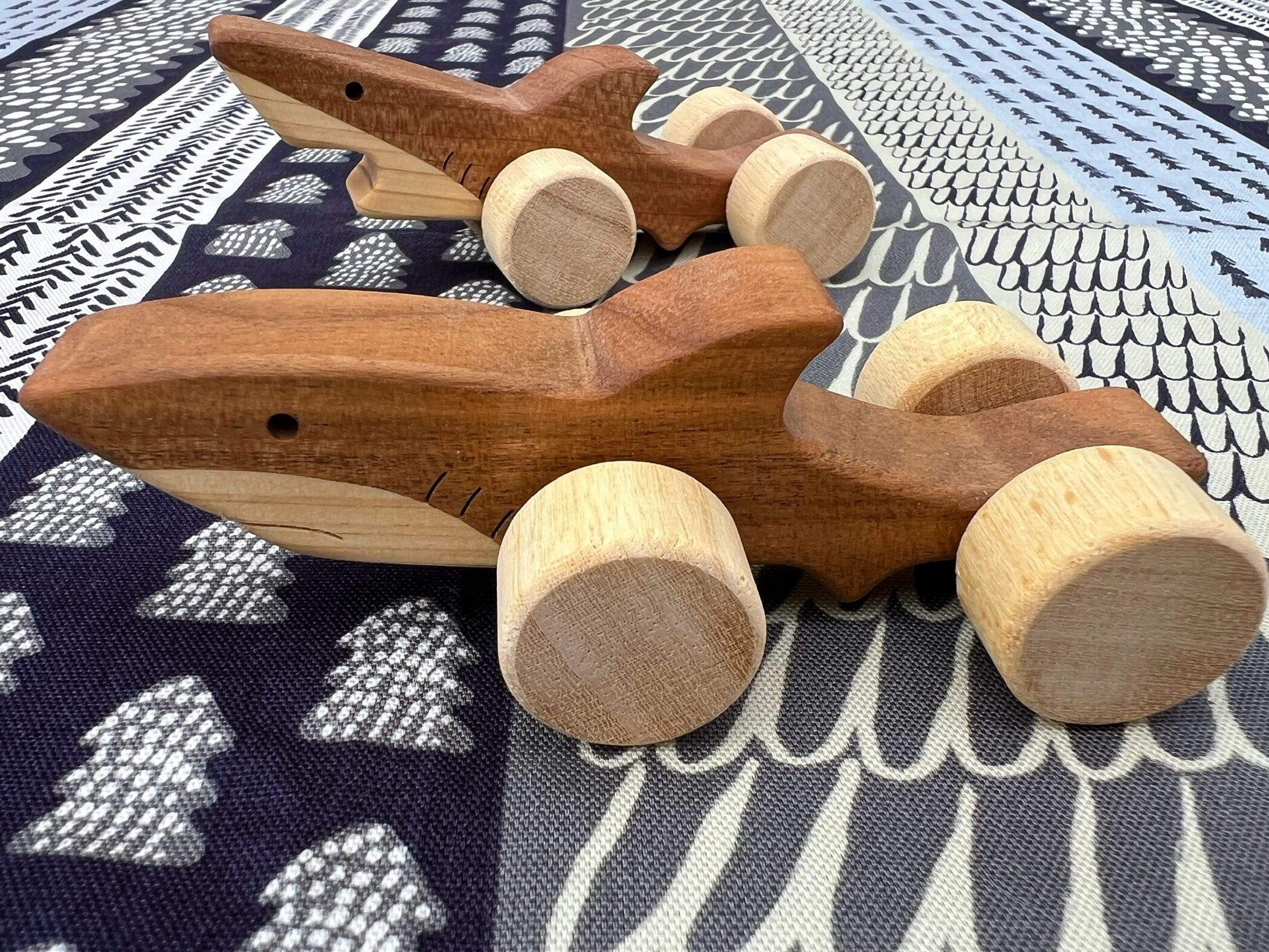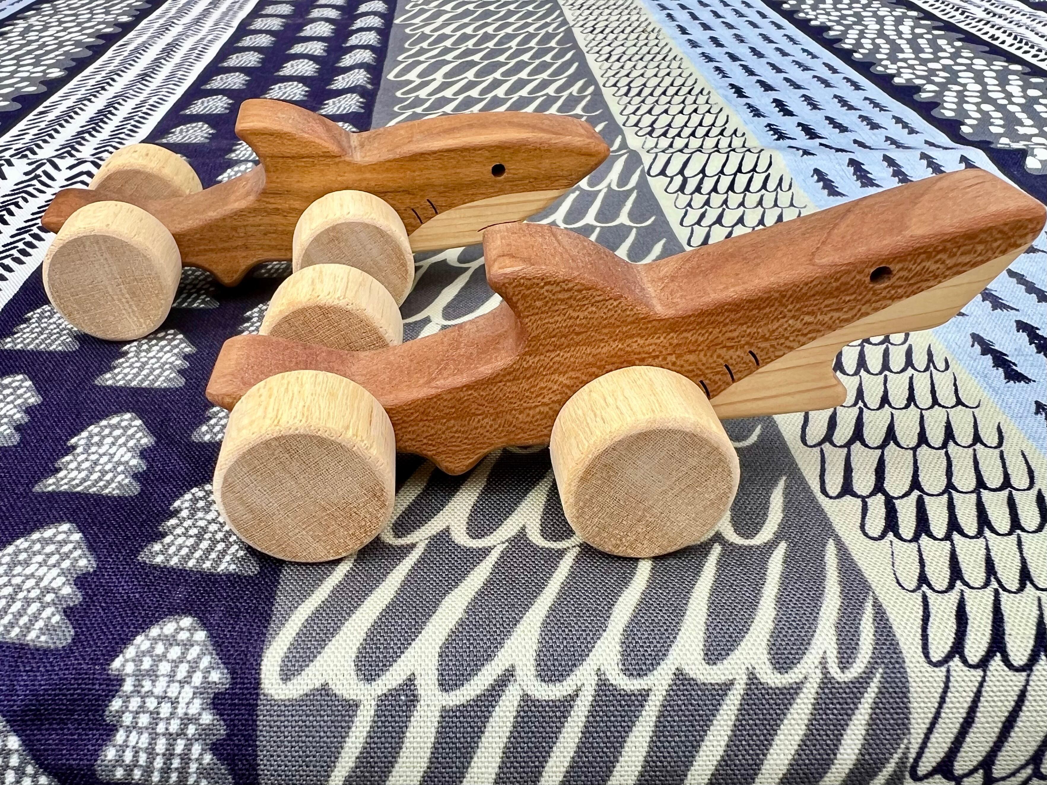 小ぶりでかわいいサメカーは、登米市産のサクラとヒノキを使用。塗料はドイツ生まれの自然塗料・オスモカラーを使用しており、安全性にも配慮し小さなお子さまにも安心してお使いいただけます。