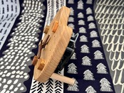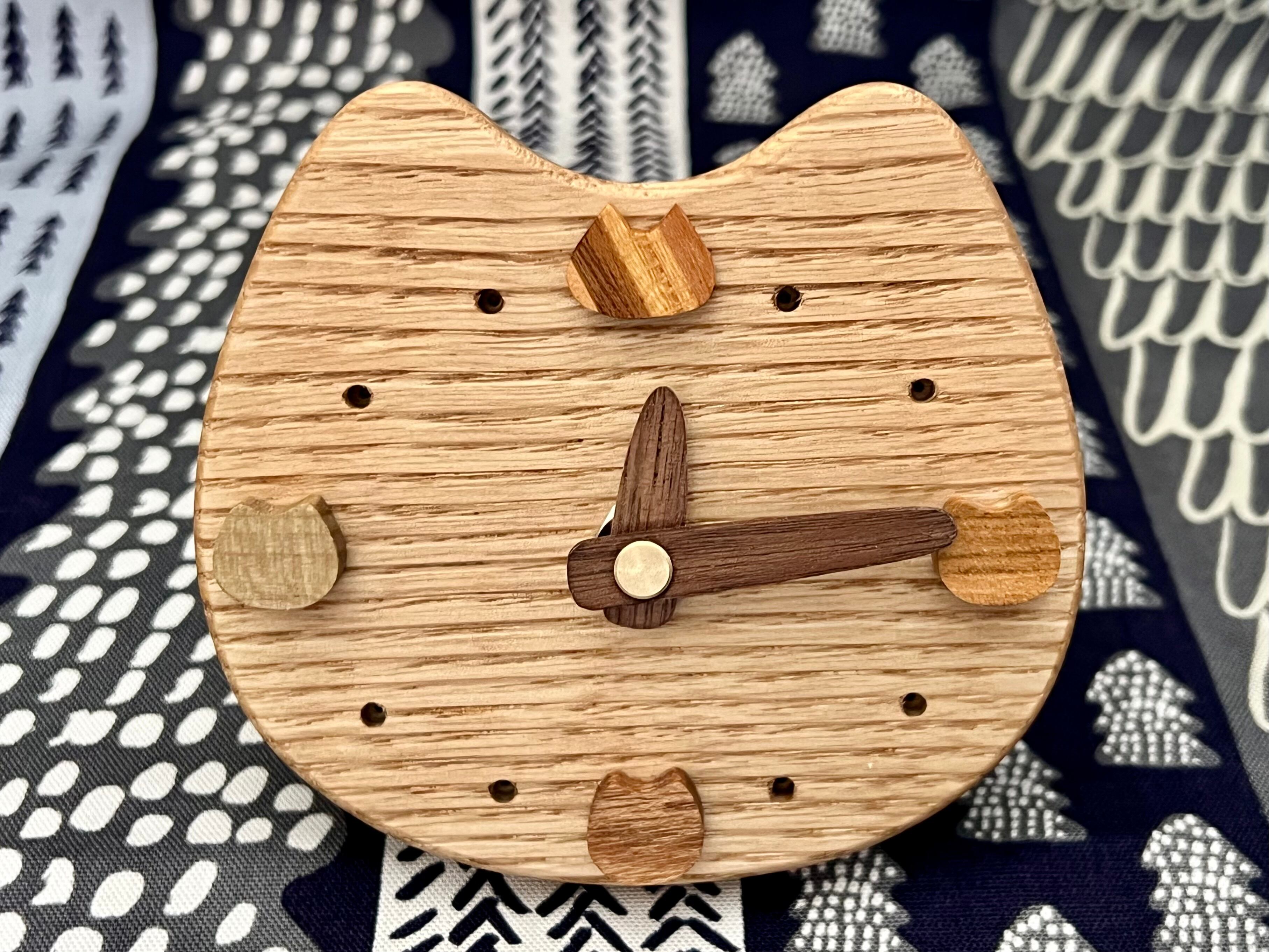ベースの木は登米市産の広葉樹・クリを使用。文字盤にはねこ型に切り抜いた様々な樹種の木を用いて、木の質感や色合いが自然な温もりを感じさせてくれます。